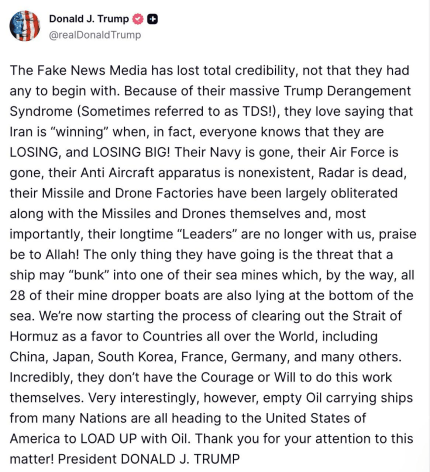 We are now beginning the process of clearing the Strait of Hormuz as a service to countries around the world, including China, Japan, South Korea, France, Germany, and many others. Incredibly, they do not have the courage or the will to do this work themselves. However, what is very interesting is that empty tankers from many countries are heading to the United States to load up on oil.