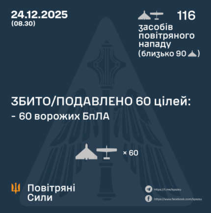 According to preliminary data, as of 08:30, air defenses shot down/suppressed 60 enemy Shahed, Gerber UAVs and drones of other types in the north, south, and east of the country.