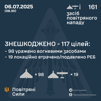 As of 08:30, air defenses neutralized 117 enemy Shahed UAVs (and other types of UAVs) in the north, east, south, and center of the country. 98 were shot down by fire weapons, 19 were lost/suppressed by electronic warfare.