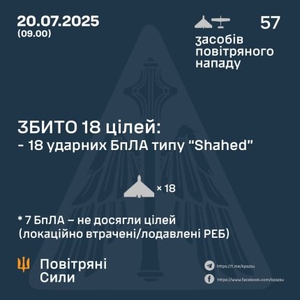 During the night of July 19-20, Russian invaders attacked peaceful Ukrainian cities and villages with 57 Shahed attack UAVs and simulator drones of various types. Air defense forces were able to destroy 18 of them and neutralize 7 more.
