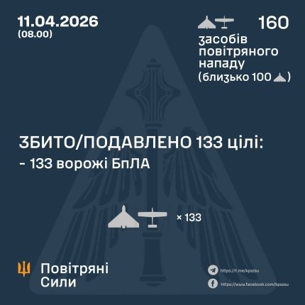 According to preliminary data, as of 08:00, air defenses shot down/suppressed 133 enemy Shahed, Gerbera, Italmas UAVs and drones of other types in the north, south, and east of the country.