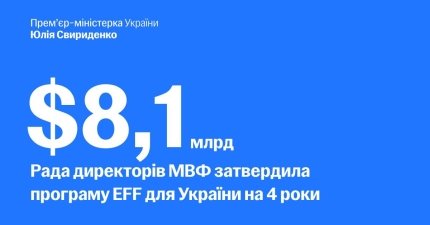 Prime Minister Yulia Svyrydenko officially confirmed that the Board of Directors of the International Monetary Fund has approved a new four-year Extended Fund Facility for Ukraine worth $8.1 billion.