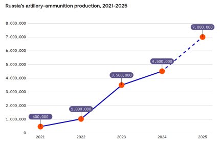Estonia's Foreign Intelligence Service has learned that factories in Russia managed to produce more than 7 million shells, mortar shells, and missiles last year, compared to 4.5 million in 2024.