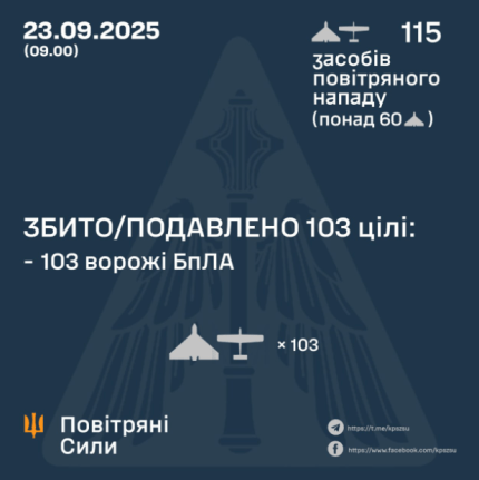 According to preliminary data, as of 09:00, air defenses shot down/suppressed 103 enemy Shahed, Gerber UAVs and drones of other types in the north, south, and east of the country.