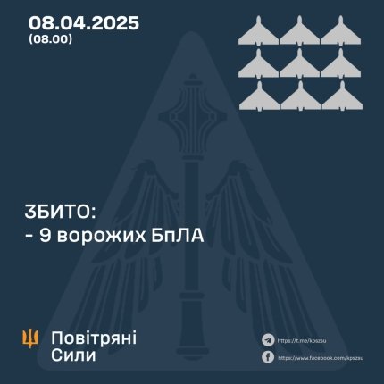 During a new air attack on peaceful Ukrainian cities and villages by the aggressor country Russia on April 8, air defense forces destroyed 9 Russian drones, and another 31 enemy drones were lost in location and did not reach their targets.