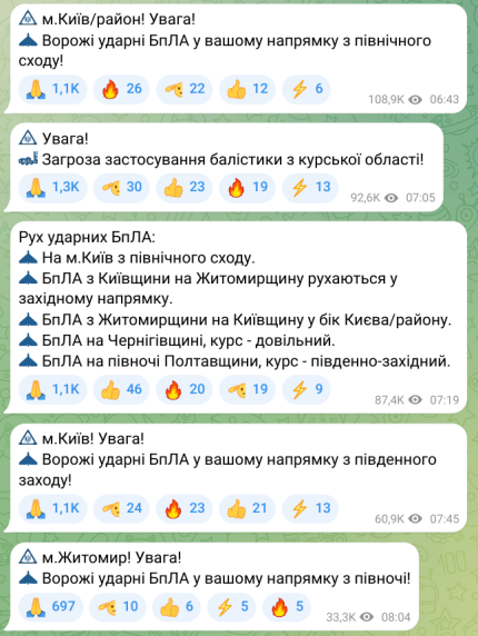 Kyiv city/district! Attention! Enemy strike UAVs in your direction from the northeast! — reported the Air Force of the Armed Forces of Ukraine.