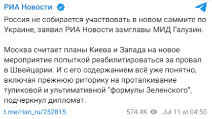 Deputy Foreign Minister Mykhailo Galuzin announced Russia's refusal to participate in the second Peace Summit.