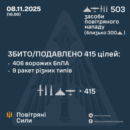 According to preliminary data, as of 10:00, air defenses shot down/suppressed 415 air targets: