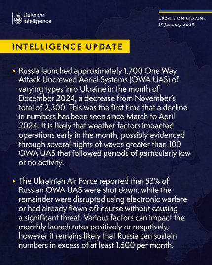 - According to British intelligence, the number of Russian drone attacks on Ukraine decreased in December 2024 compared to the previous month.