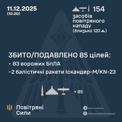 - Ukrainian Air Force successfully intercepted and destroyed 83 drones and 2 Iskander missiles during the attack.