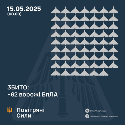 - Russian terrorists launched 110 drones against Ukraine on May 15, with Ukrainian air defense successfully shooting down 62 drones.