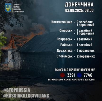 The head of the Donetsk Oblast Armed Forces, Vadym Filashkin, reports that on August 2, Russian invaders killed 5 residents of the Donetsk region: 2 in Kostyantynivka, 1 each in Siversk, Pokrovsk, and Raiske.