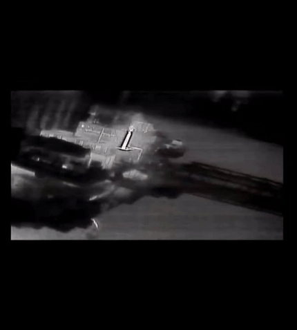 The drone's onboard camera recorded a successful hit in the area of the platform's gas turbine installation.