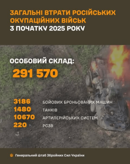 The figures provided by the occupiers regarding the captured territories and settlements are significantly overstated. At the same time, the 100% confirmed result achieved by the Russians since the beginning of 2025 is their total losses of over 291 thousand soldiers killed and wounded, the General Staff of the Armed Forces of Ukraine emphasizes.