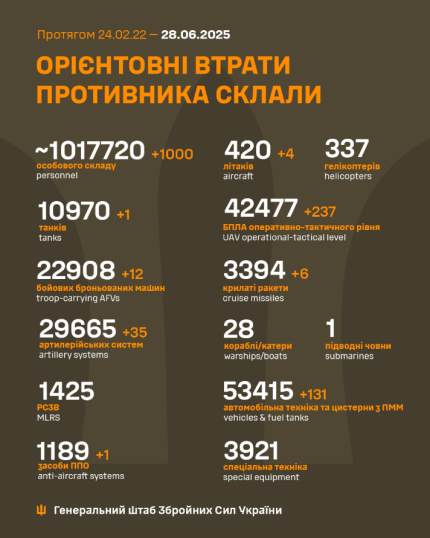 Losses of the Russian army as of June 28, 2025