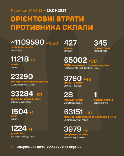 The General Staff of the Armed Forces of Ukraine officially confirmed that on September 28, aviation, missile troops, and artillery of the Defense Forces of Ukraine successfully attacked two areas of concentration of personnel, weapons, and military equipment, one UAV control point, and five other important facilities of the Russian invaders.