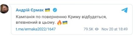Ця війна триває. Я впевнений, що кампанія з повернення Криму відбудеться, – підкреслив Єрмак.
