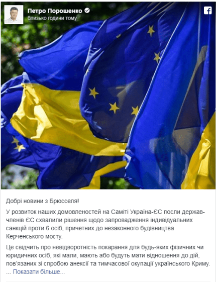 "Хороші новини з Брюсселя! У розвиток наших домовленостей на саміті Україна-ЄС посли держав-членів ЄС прийняли рішення про введення індивідуальних санкцій проти 6 осіб, причетних до незаконного будівництва Керченського мосту", - написав Порошенко.