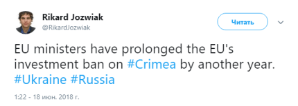 "Міністри ЄС продовжили ще на один рік заборону на інвестиції в Крим", - сказано в повідомленні журналіста.