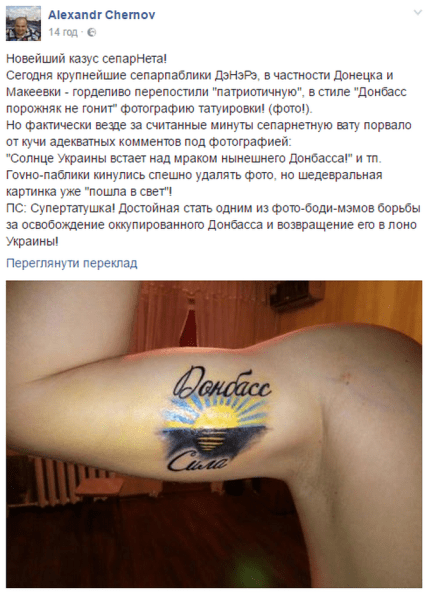 Соцмережі насмішило фото патріотичної татуювання, яке поширили в сепаратистських інтернет-спільнотах фанатів ДНР.