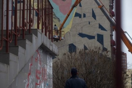 Частина муралу створювалася в холодну і дощову погоду, але це не завадило художнику створити красиву і деталізовану роботу.