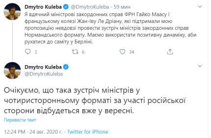 "Я вдячний міністру закордонних справ ФРН Гайко Маасу і французькому колезі Жан-Ів Ле Дріану, які підтримали мою пропозицію незабаром провести зустріч міністрів закордонних справ Нормандського формату. Повинні використовувати позитивну динаміку, щоб рухатися до саміту в Берліні. Очікуємо, що така зустріч міністрів в чотирибічному форматі за участю російської сторони відбудеться вже у вересні ", - повідомив Кулеба.