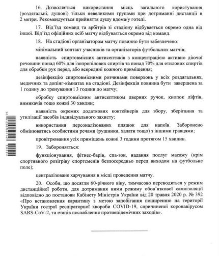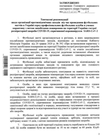 За офіційними даними, нова постанова відомства стає чинною вже у вівторок, 26 травня. Згідно з документом, матчі Української Прем'єр-ліги проходитимуть у присутності не більше 200 осіб на стадіоні - йдеться також безпосередньо про футболістів.