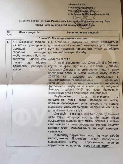 Документ був підписаний ще 19 серпня 2015 року. У ньому йдеться, що клуб-заявник повинен проінформувати Дирекцію Прем'єр-ліги про місце проведення матчу не пізніше ніж за 14 діб до базової дати туру.