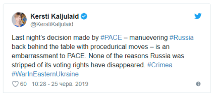 Президентка Естонії Керсті Кальюлайд жорстко розкритикувала ПАРЄ за прийняття резолюції, що відкриває шлях до повернення російської делегації без виконання умов. Про це вона написала у своєму Twitter, передає ONLINE.UA.