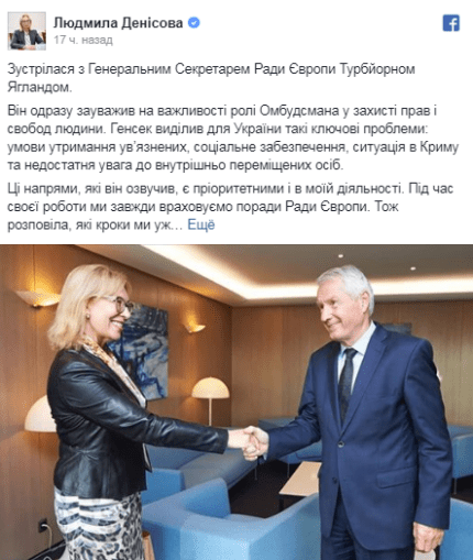 Крім проблеми політзаклююченних, Денисова і Ягланд обговорили проблеми з соціальним забезпеченням в окупованих Криму та Донбасі, а також недостатню увагу, яка приділяється внутрішньо переміщеним особам.