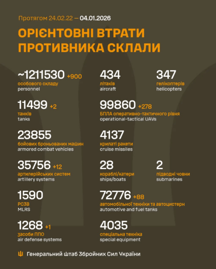 Загальні бойові втрати противника з 24.02.22 по 04.01.26 орієнтовно склали:
