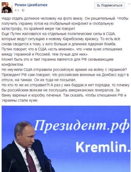 За словами українського журналіста Романа Цимбалюка, Путіну варто віддати належне: "Він рішучий. Щоб отримати Україну, готовий на глобальний конфлікт і глобальну катастрофу, принаймні, так говорить".