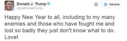 "З Новим Роком всіх, в тому числі безліч моїх супротивників і тих, хто боровся зі мною, але програв з таким тріском, що тепер не знають, що робити. Люблю!", - уїдливо написав Дональд Трамп.