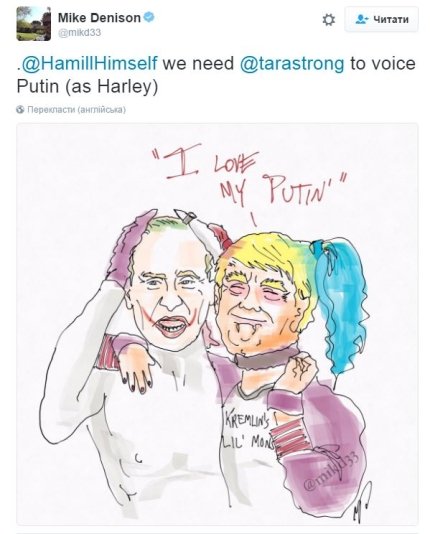 Після появи озвучення сценарист Освальт запропонував "ідею на мільйон" - створити додаток, який зачитував б всі твіти Трампа голосом Джокера. Хемілл зазначив, що не проти взяти участь в цій ідеї, і поставив хештеги, що натякають на зв'язок Трампа з Кремлем і президентом РФ Володимиром Путіним, якого в мережі запропонували озвучити голосом подружки Джокера - Харлі Квін.