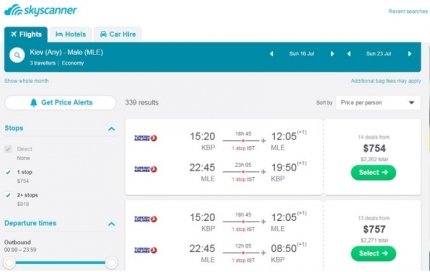 Журналіст зазначає, що найдешевший переліт на Мальдіви для 2 дорослих з дитиною, за даними сайту skyscanner.net коштує $2 260, якщо подорожувати економ-класом. У бізнес-класі- вартість квитків потрібно потроїти, і тоді вийде $7000-8000 на сім'ю.