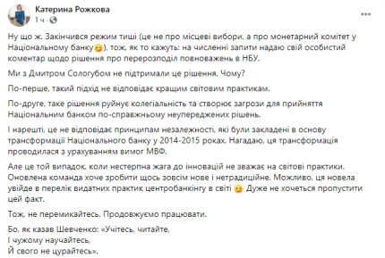"Ми з Дмитром Сологубом не підтримали це рішення. Чому? По-перше, такий підхід не відповідає найкращим світовим практикам. По-друге, таке рішення руйнує колегіальність і створює загрози для прийняття Національним банком по-справжньому неупереджених рішень. І нарешті, це не відповідає принципам незалежності, які були закладені в основу трансформації Національного банку в 2014-2015 роках. Нагадаю, ця трансформація проводилася з урахуванням вимог МВФ ", - прокоментувала рішення Шевченко Рожкова.