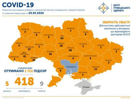 Нагадаємо, в неділю, 29 березня, число хворих на коронавірус в Україні збільшилося - станом на 10:00 підтверджено 418 випадків зараження. За останню добу було виявлено 109 нових випадки. Важливо відзначити, що інфекція дісталася вже до кожного регіону країни.