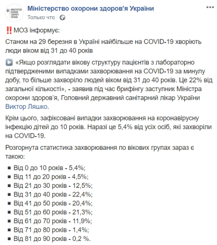 На сьогоднішній день більшість випадків зараження коронавірусом в Україні припадає на пацієнтів у віці 31-60 років. При цьому більше 5% від усіх захворілих складають діти у віці до 10 років. Такі вікові групи ризику озвучив головний державний санітарний лікар України Віктор Ляшко на брифінгу 29 березня, передає ONLINE.UA.