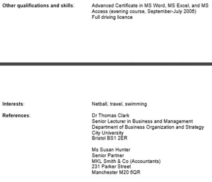 Education and qualifications – освіта, прослухані курси, сертифікати, пов`язані зі сферою працевлаштування. Не потрібно вказувати все, що ти вмієш, саме в цьому розділі: знання іноземних мов зазвичай виноситься до Skills, а сертифікат з володіння Photoshop (якщо твоя спеціальність не пов`язана з графічним дизайном та фотографією безпосередньо) – до Interests and achievements.