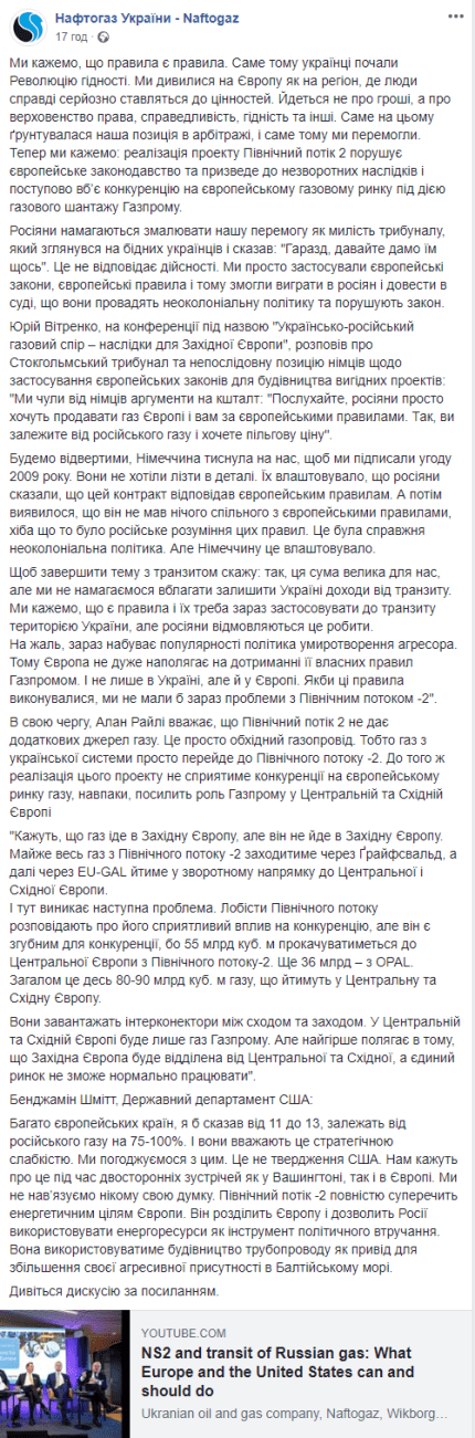 Комерційний директор Нафтогазу Юрій Вітренко заявив, що майже весь газ з "Північного потоку-2" заходитить через Грайфсвальд, а далі через EU-GAL піде в зворотному напрямку Центральної та Східної Європи. Він наголосив, що Західна Європа буде відділена від Центральної і Східної, а єдиний ринок не зможе нормально працювати.