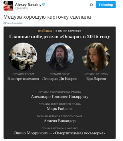 З п'ятої спроби американський актор таки отримав довгоочікувану статуетку. Кіноакадемія присудила ДіКапріо нагороду за роль у фільмі "Той, що вижив" ("Легенда Х'ю Гласса").