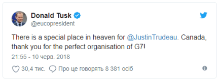 "На небесах є особливе місце для Джастіна Трюдо. Канада, дякую за ідеальну організацію саміту G7!"- сказано в повідомленні.