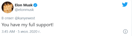 На твіт репера в числі інших відреагував засновник Tesla та SpaceX Ілон Маск, який запевнив Каньє Веста в тому, що він може розраховувати на його підтримку.