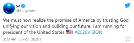 "Ми повинні втілити обіцянки Америки, вірячи в Бога, об'єднавши наше бачення і побудувавши наше майбутнє. Я балотуюся в президенти Сполучених Штатів!", - написав Каньє Вест в соцмережі, супроводивши пост тегом #2020VISION.