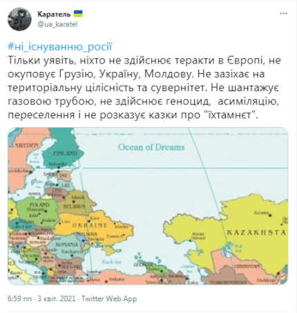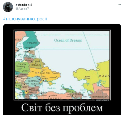 У мережі з'явилася карта світу без Росії. Її вже кілька днів поширюють користувачі з хештегом #ні_існуванню_росії. Уже кілька тисяч людей запостили карту в Twitter і Facebook.