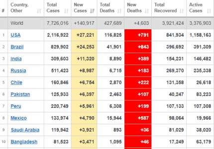 Варто звернути увагу на те, що за весь час пандемії зареєстрували 7 мільйонів 731 тисячу випадків зараження. Побороли хворобу вже 3 мільйони 925 тисяч людей, загинули – 428 тисяч. 12 червня у світі зареєстрували майже 141 тисячу нових хворих на коронавірус. Ще 11 червня їх кількість становила 137 тисяч, 10 червня – 134 тисячі. Найбільше нових випадків виявили у США – понад 27 тисяч. У Бразилії підтвердили трохи менше – близько 24 тисяч. В Індії за добу зафіксували 11,3 тисяч нових хворих, у Росії – майже 9 тисяч, у Чилі – 6,7 тисяч, у Пакистані – 6,3 тисяч, у Перу – майже 6 тисяч, у Мексиці – 4,8 тисяч та майже 4 тисячі у Саудівській Аравії. Цього ж дня від ускладнень коронавірусу померли 4603 особи.