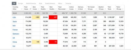Згідно з останніми даними, 14 квітня у всьому світі було зареєстровано 2 000 243 випадків захворювання. 484 573 осіб одужала та 126 753 померло від ускладнень, спричинених хворобою. У США вже зафіксували 614 246 випадків захворювання на коронавірус, в Великій Британії 93 873, Франції 143 303, Іспанії 174 060, Туреччині 65 111. Найбільше летальних випадків від вірусу у США 26 064, в Італії 21 067, Іспанії 18 255.
