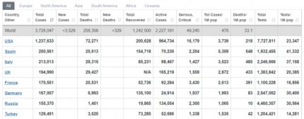 Станом на ранок 6 травня у світі вже налічується 3 728 047 випадків захворювання. 1 242 500 осіб одужали та 258 533 померли від ускладнень, спричинених хворобою. За останню добу у світі зареєстрували 80 609 нових випадків зараження коронавірусною інфекцією. Від ускладнень, спричинених хворобою, померли 5742 особи. Очолює сумну першість за кількістю летальних випадків за останню добу США, там померло 2329 осіб. У Великій Британії жертвами захворювання стала 693 особи, у Бразилії – 578, у Франції – 330, в Італії – 236 жертв. Найбільше нових випадків підтвердили у США – 24 тисяч. За цей період у Росії діагностували 10 тисяч хворих, у Бразилії – майже 7 тисяч.