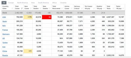 Станом на ранок 21 квітня число хворих на коронавірус в усьому світі вже сягнуло 2 482 556. Померли 170 482 людини, змогли побороти хворобу 652 479 осіб. Лідером за темпами поширення пандемії залишаються США. За добу там діагностували майже 28 тисяч заражень. За цей же час у Великій Британії та Туреччині підтвердили по 4,6 тисяч інфікувань. У Росії 20 квітня нарахували 4,2 тисяч нових випадків, у Франції – 2,5 тисяч, в Італії – 2,2 тисяч, у Бразилії – понад 2 тисячі та 1,7 тисяч у Канаді.