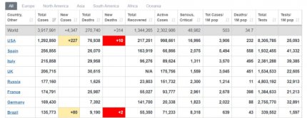Варто зазначити, що протягом минулої доби у всьому світі зафіксували 95,217 тисяч випадків заражень на коронавірус та 5566 смертей від хвороби. Найбільше нових хворих виявили у США – понад 29 тисяч. У Росії за цей час підтвердили більше 11 тисяч інфікувань, у Бразилії – майже 8,5 тисяч, у Великій Британії – 5,6 тисяч, у Перу – більше 3 тисяч. В Іспанії діагностували 3173 випадки зараження. Найбільше смертей за вказаний період зареєстрували також у США – 2109 жертв. Окрім того, у Бразилії померли 600 осіб, у Великій Британії – 539, в Італії – 274, в Іспанії – 213, у Мексиці – 197, у Франції – 178 та 176 жертв у Канаді.